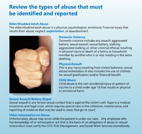 Unfortunately, abuse may occur while the patient is under our care. Any employee who
