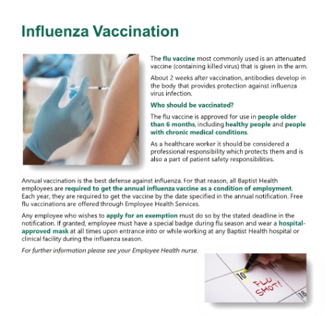 Annual vaccination is the best defense against influenza. For that reason, all Baptist Health